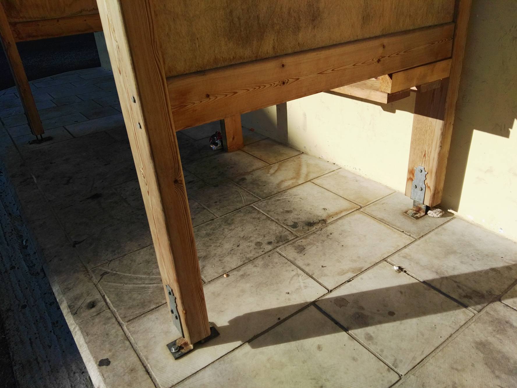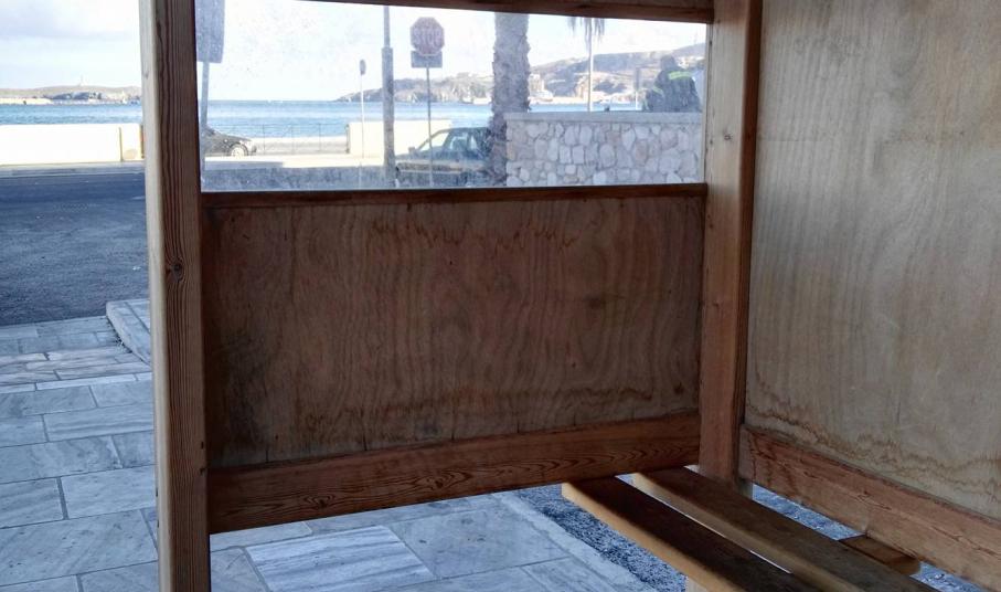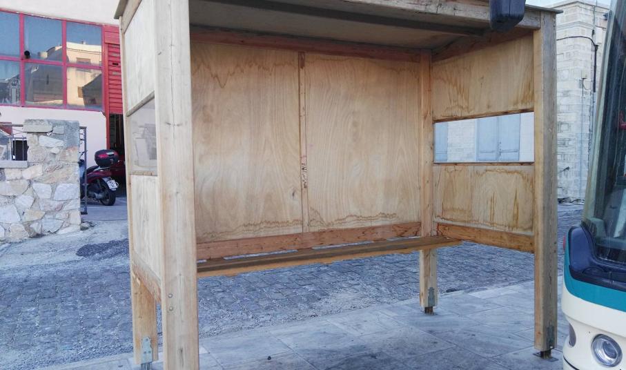 Πέραν της προχειρότητας που διακρίνεται συνολικά στη διαμόρφωσή του, όπως αυτή έχει αποτυπωθεί σε προηγούμενη αναφορά της εφημερίδας σε επίπεδο οριοθέτησης του χώρου, ρίψης ασφάλτου με ανομοιόμορφο τρόπο σε αρκετά σημεία, καθώς και κλεισίματος του μικρού τμήματος δρόμου που γειτνιάζει με αυτόν τον χώρο, μα και τοποθέτησης του συνόλου των κάδων πλησίον των σταθμευμένων λεωφορείων, την κάκιστη ποιοτικά εικόνα έρχονται να “συμπληρώσουν” οι δύο ξύλινες στάσεις λεωφορείων.