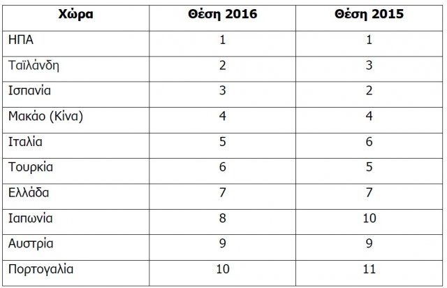 Για την Ελλάδα και τους ανταγωνιστές της, ο παρακάτω πίνακας παρουσιάζει την παγκόσμια κατάταξη με βάση τις τουριστικές αφίξεις και τις τουριστικές εισπράξεις κατά το 2016 (στην παρένθεση η αντίστοιχη θέση κατά το 2015).