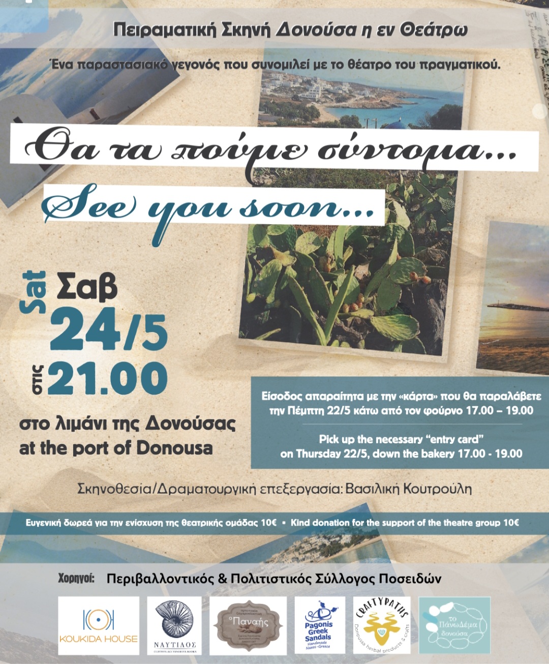 Η Πειραματική Σκηνή της Δονούσας «η εν Θεάτρω» σας προσκαλεί το Σάββατο 24 Μαΐου 2025 σε ένα ξεχωριστό θεατρικό δρώμενο με τίτλο «Θα τα πούμε σύντομα…», μια παράσταση που γεννήθηκε από μια απρόσμενη ιστορία του νησιού και ταξιδεύει ανάμεσα σε μνήμη, συναίσθημα και ανθρώπινη σύνδεση.