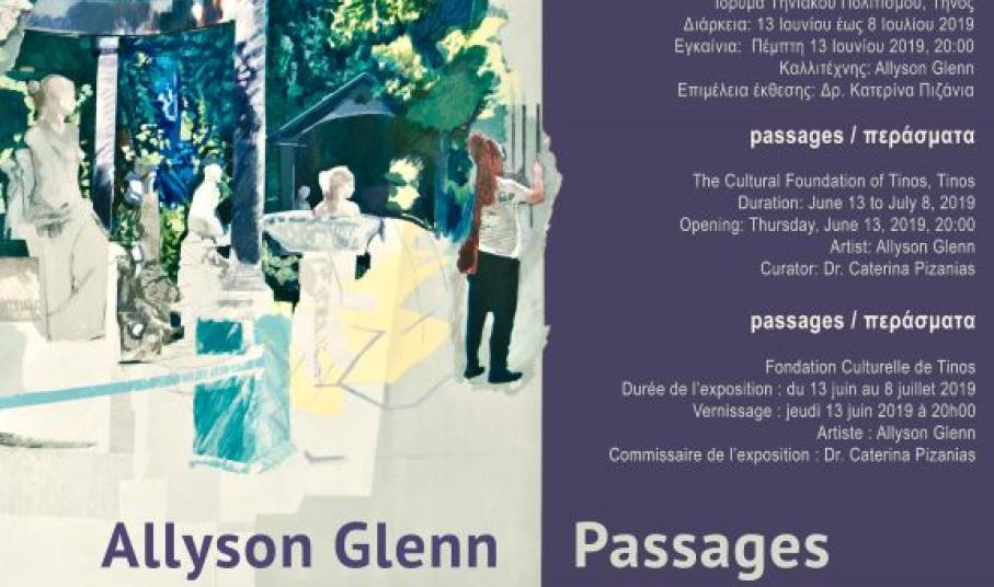 Στην έκθεση «passages / περάσματα» η Glenn ξανα-αφηγείται παλιές ιστορίες με σκοπό να διερευνήσει νέες δυνατότητες καθιστώντας «ορατούς» (και πιθανόν συναφείς) στους καιρούς μας τους αρχαίους θεούς και τις ενέργειές τους, μέσα από μια σειρά ζωγραφικών και δημιουργικών «αλληγοριών» που αμφιταλαντεύονται μεταξύ παρελθόντος και παρόντος.
