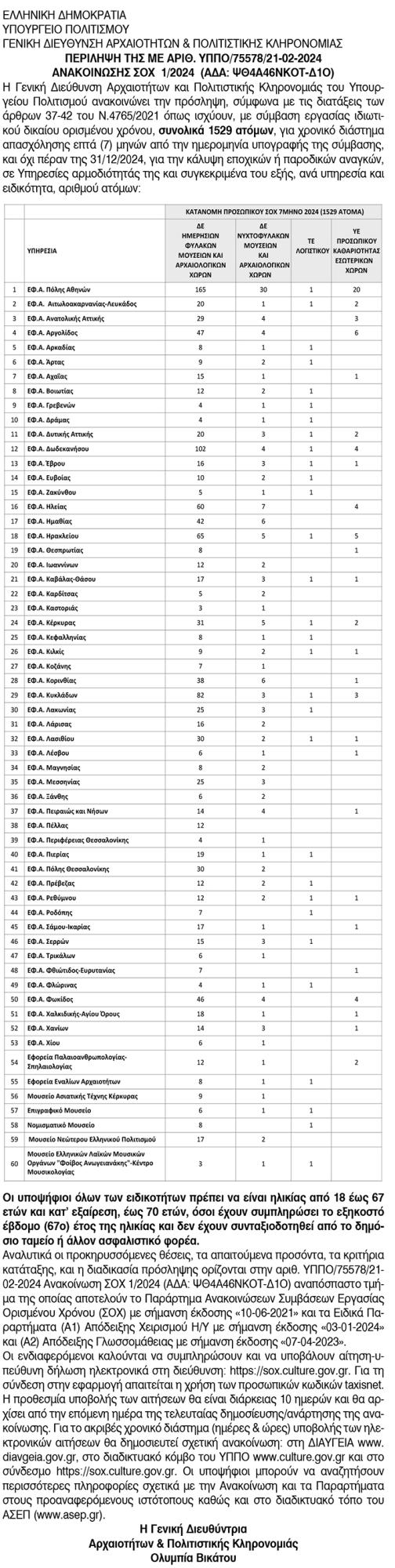 Περίληψη ανακοίνωσης ΣΟΧ1/2024, από Υπουργείο Πολιτισμού Γεν. Διεύθυνση Αρχαιοτήτων & Πολιτιστικής κληρονομιάς Τρίτη 5 Μαρτίου 2024 - 16:05 Συντάκτης: Ρένα Ρούσσου Κείμενο Βλέπε εικόνα. Αριθμός Φύλλου 6322 Κατηγορία Προκήρυξη Θέσεων