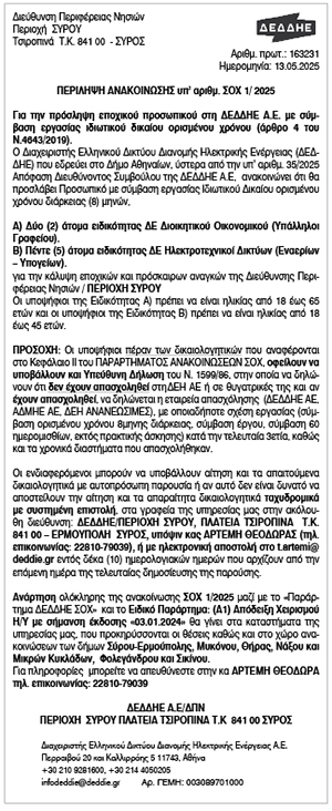 Περίληψη ανακοίνωσης υπ' αριθμ. ΣΟΧ 1/2025, από ΔΕΔΔΗΕ Περιοχή Σύρου Παρασκευή 23 Μαΐου - 14:01 Συντάκτης: Ρένα Ρούσσου Κείμενο Βλέπε εικόνα. Αριθμός Φύλλου 6614 Κατηγορία Προκήρυξη Θέσεων