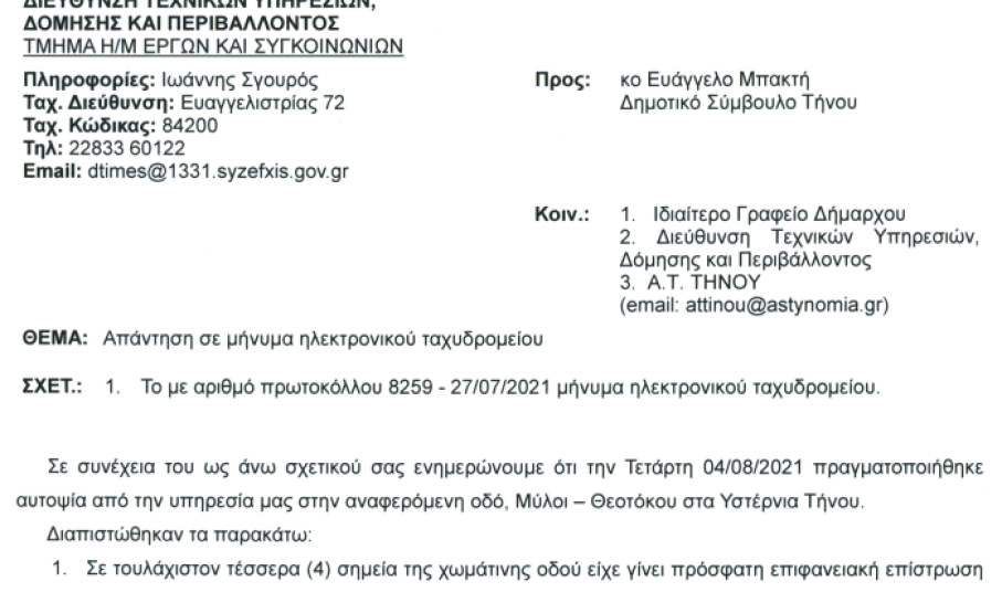 Η Ανεξάρτητη Δημοτική κίνηση "Κοινό Τηνίων" μετά από ένα σχετικό ερώτημα προς τις υπηρεσίες του Δήμου και την σχετική απάντηση της υπηρεσίας, κατέθεσε σήμερα ηλεκτρονικά μια αναφορά - καταγγελία - αίτηση στο Αστυνομικό Τμήμα Τήνου προκειμένου να διερευνηθεί ποιος διενεργεί εργασίες χωρίς άδεια στον δημοτικό δρόμο που ενώνει τους Μύλους Υστερνίων με τον ναό της Β' Εύρεσης.