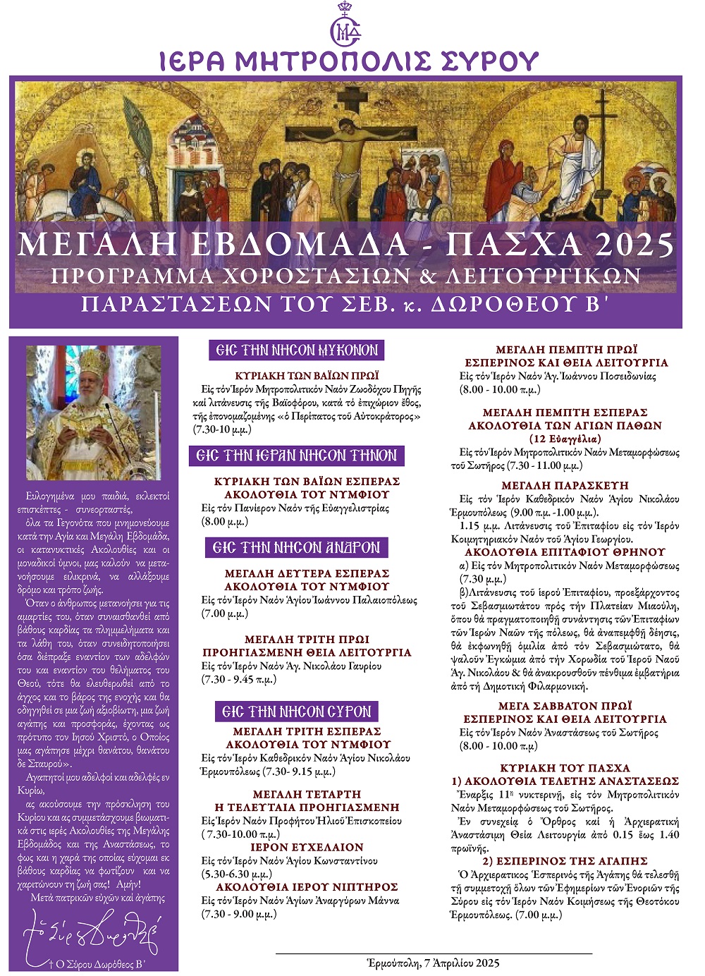Πρόγραμμα ακολουθιών Μεγάλης Εβδομάδας, από την Ιερά Μητρόπολη Σύρου Τρίτη 15 Απριλίου - 14:46 Συντάκτης: Ρένα Ρούσσου Κείμενο Βλέπε εικόνα. Αριθμός Φύλλου 6589 Κατηγορία Ανακοίνωση