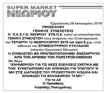 Πρόσκληση Γενικής Συνέλευσης Δευτέρα 11 Φεβρουαρίου 2019 - 13:09 Συντάκτης: Κατερίνα Βιδάλη Κείμενο Βλέπε εικόνα Αριθμός Φύλλου 5063 Κατηγορία Πρόσκληση Γεν. Συνελεύσεων