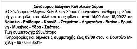 Πρόσκληση για Εκδρομή από τον Σύνδεσμο Ελλήνων Καθολικών Σύρου Πέμπτη 8 Σεπτεμβρίου 2022 - 14:42 Συντάκτης: Ρένα Ρούσσου Κείμενο Βλέπε εικόνα. Αριθμός Φύλλου 5955 Κατηγορία Πρόσκληση