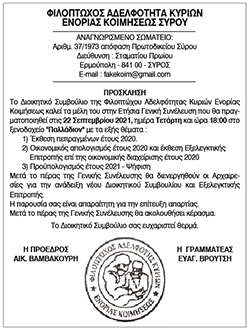 Πρόσκληση για Γενική Συνέλευση από την Φιλόπτωχο Αδελφότητα Κυριών Ενορίας Κοιμήσεως Σύρου Τετάρτη 22 Σεπτεμβρίου 2021 - 14:15 Συντάκτης: Ρένα Ρούσσου Κείμενο Βλέπε εικόνα. Αριθμός Φύλλου 5714 Κατηγορία Πρόσκληση Γεν. Συνελεύσεων