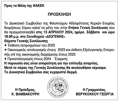 Πρόσκληση σε Γενική Συνέλευση από την Φιλόπτωχο αδελφότητα κυριών Ενορίας Κοιμήσεως Σύρου Πέμπτη 11 Απριλίου 2024 - 15:13 Συντάκτης: Ρένα Ρούσσου Κείμενο Βλέπε εικόνα. Αριθμός Φύλλου 6347 Κατηγορία Πρόσκληση Γεν. Συνελεύσεων