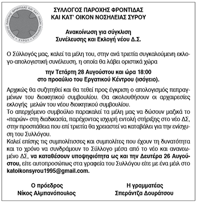 Πρόσκληση σε γενική συνέλευση και εκλογές από το Σύλλογο Παροχής φροντίδας και Κατ' οίκον Νοσηλείας Σύρου Δευτέρα 26 Αυγούστου 2024 - 14:09 Συντάκτης: Ρένα Ρούσσου Κείμενο Βλέπε εικόνα. Αριθμός Φύλλου 6433 Κατηγορία Πρόσκληση Γεν. Συνελεύσεων