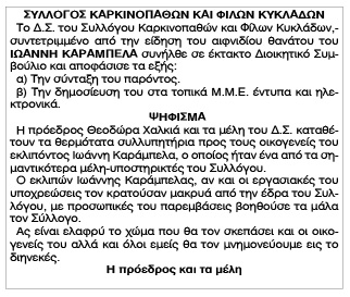 Ψήφισμα του Συλλόγου Καρκινοπαθών και Φίλων Κυκλάδων Τρίτη 4 Σεπτεμβρίου 2018 - 13:16 Συντάκτης: Κατερίνα Βιδάλη Κείμενο Βλέπε εικόνα Αριθμός Φύλλου 4954 Κατηγορία Ψήφισμα