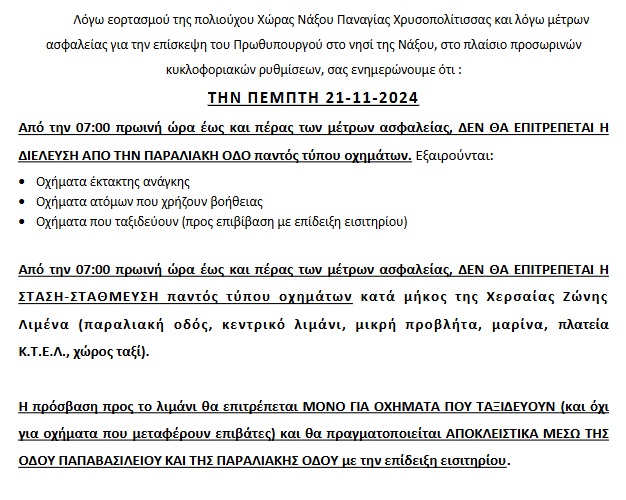 Κυκλοφοριακές ρυθμίσεις στη Χώρα της Νάξου την Πέμπτη 21/11 λόγω εορτασμού της πολιούχου Χώρας Νάξου Παναγίας Χρυσοπολίτισσας, αλλά και λόγω των μέτρων ασφαλείας που αφορούν την επίσκεψη του πρωθυπουργού Κυρ. Μητσοτάκη στο νησί της Νάξου, ανακοίνωσε το Λιμεναρχείο Νάξου.