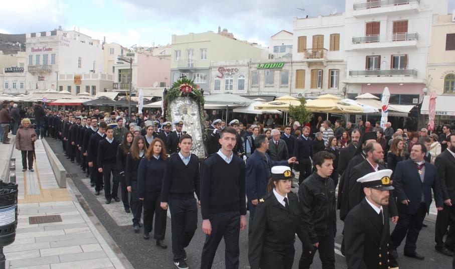 «Σε αυτή την πόλη, που τη γέννησε η προσφυγιά, αλλά μεγαλούργησε με την επινοητικότητα των κατοίκων της, δίνεται σήμερα ένα μήνυμα στην πατρίδα μας και σε ολόκληρο τον κόσμο, ότι η Ελλάδα χωρίς τη θάλασσα δεν μπορεί να ζήσει και να υπάρξει», ανέφερε χαρακτηριστικά, χρησιμοποιώντας τα λόγια των ψαράδων που με τα καΐκια τους στόλισαν το λιμάνι της Σύρου, λαμπρύνοντας την εορτή στη μνήμη του Πολιούχου της ότι «στο αίμα μας, υπάρχει η αλμύρα της θάλασσας». Εξήγησε μάλιστα, πως η θάλασσα είναι αυτή που μας γοητεύει και μας δίνει δύναμη, αυτή που κίνησε το πινέλο των ζωγράφων να την απεικονίσουν, την πένα των ποιητών να την υμνήσουν αλλά και τους στίχους των τραγουδοποιών να την τραγουδήσουν.