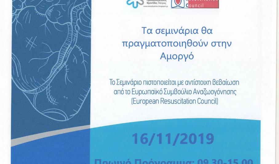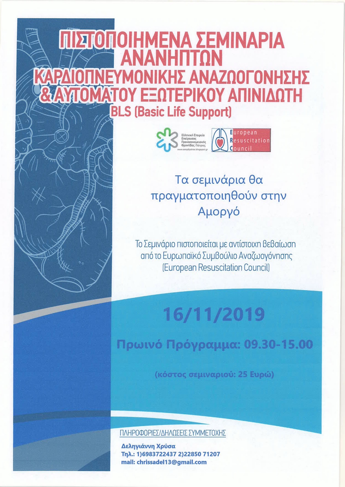 Πιστοποιημένα σεμινάριο ανανηπτών καδιοπνευμονικής αναζωογόνησης και αυτόματου εξωτερικού απινιδιωτή θα πραγματοποιηθούν στην Αμοργό στις 16 Νοεμβρίου 2019.