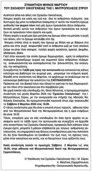 Συνάντηση μηνός Μαρτίου του Σχολείου οικογένειας της Ι. Μητροπόλεως Σύρου Δευτέρα 4 Μαρτίου 2024 - 16:28 Συντάκτης: Ρένα Ρούσσου Κείμενο Βλέπε εικόνα. Αριθμός Φύλλου 6320 Κατηγορία Ανακοίνωση