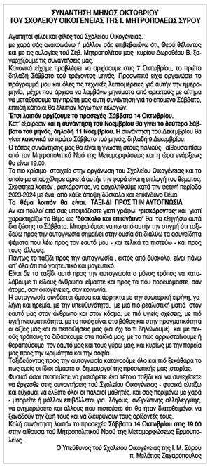 Συνάντηση μηνός Οκτωβρίου του Σχολείου Οικογένειας Παρασκευή 13 Οκτωβρίου 2023 - 14:03 Συντάκτης: Ρένα Ρούσσου Κείμενο Βλέπε εικόνα Αριθμός Φύλλου 6225 Κατηγορία Ανακοίνωση