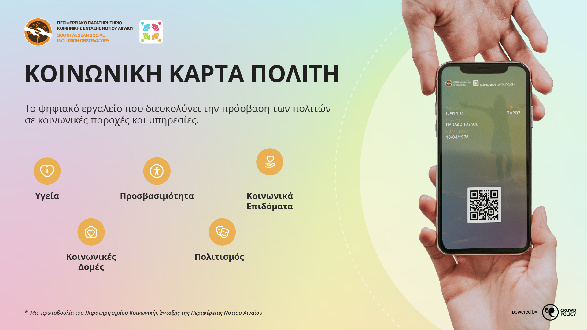 Με την Κοινωνική Κάρτα Πολίτη, ένας πολίτης ή επισκέπτης της Περιφέρειας Νοτίου Αιγαίου αφού κάνει εγγραφή, στη συνέχεια μπορεί να αντλήσει πληροφορίες, εύκολα και γρήγορα από το κινητό ή τον υπολογιστή του, για δομές υγείας της περιοχής όπου βρίσκεται, για προσβάσιμους πολιτιστικούς χώρους και υποδομές, για βασικά κοινωνικά επιδόματα, δομές κοινωνικής προστασίας και πολιτιστικά δρώμενα.