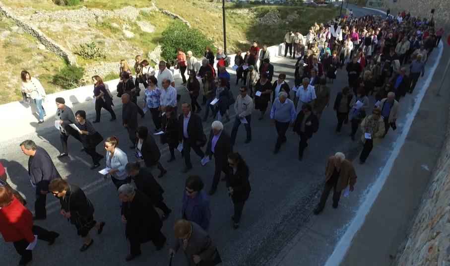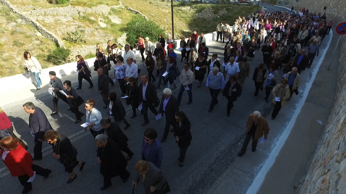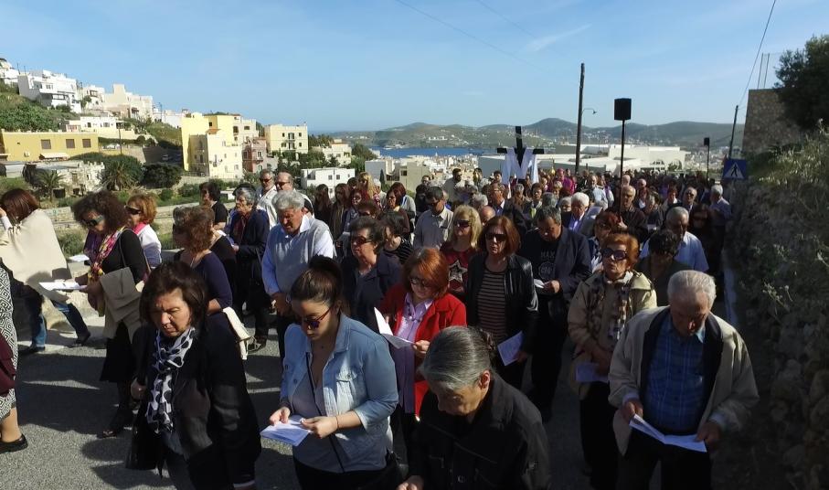 Με επικεφαλής τον Σεβασμιώτατο π. Πέτρο Στεφάνου, η διαδρομή ξεκίνησε κάτω από το Δημοτικό Σχολείο, στους πρόποδες του Λόφου της Άνω Σύρου και κατέληξε στον Ιερό Ναό Αγίου Γεωργίου.