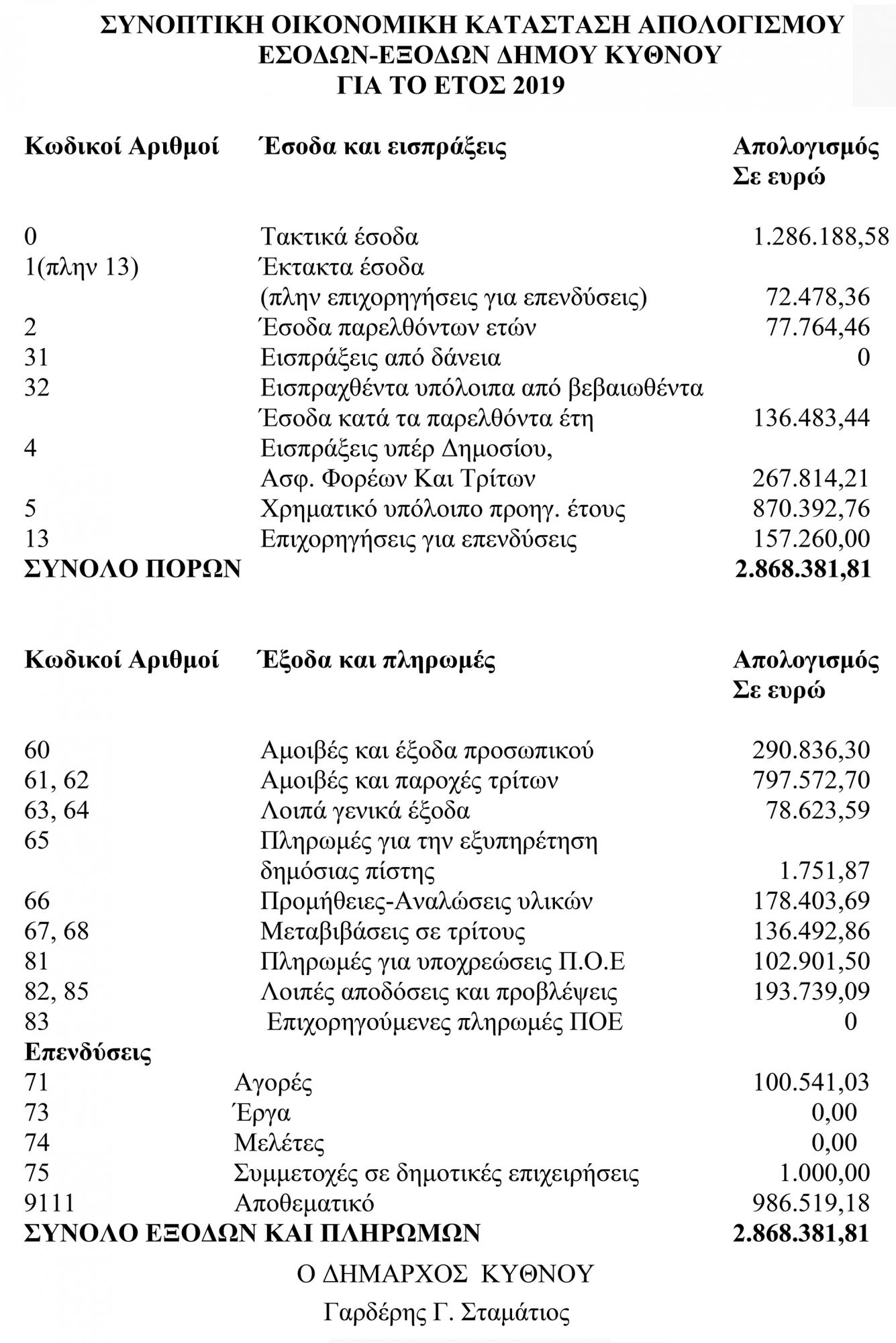 Συνοπτική Οικονομική Κατάσταση Απολογισμού Εσόδων - Εξόδων Δήμου Κύθνου για το έτος 2019 Πέμπτη 23 Ιουνίου 2022 - 12:56 Συντάκτης: Ρένα Ρούσσου Κείμενο Βλέπε εικόνα. Αριθμός Φύλλου 5901 Κατηγορία Απολογισμός