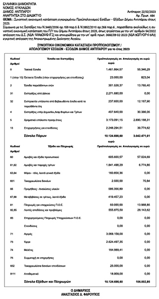 Συνοπτική οικονομική κατάσταση Προϋπολογισμού / Απολογισμού εσόδων - εξόδων Δήμου Αντιπάρου για το έτος 2023 Παρασκευή 24 Φεβρουαρίου 2023 - 14:38 Συντάκτης: Ρένα Ρούσσου Κείμενο Βλέπε εικόνα. Αριθμός Φύλλου 6071 Κατηγορία Προϋπολογισμοί