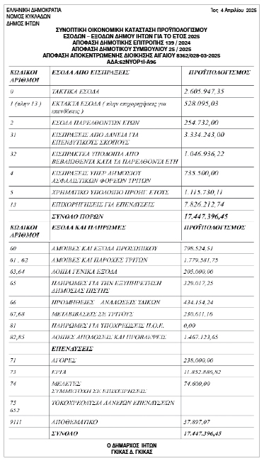 Συνοπτική οικονομική κατάσταση Προϋπολογισμού εσόδων - εξόδων Δήμου Ιητών για το έτος 2025