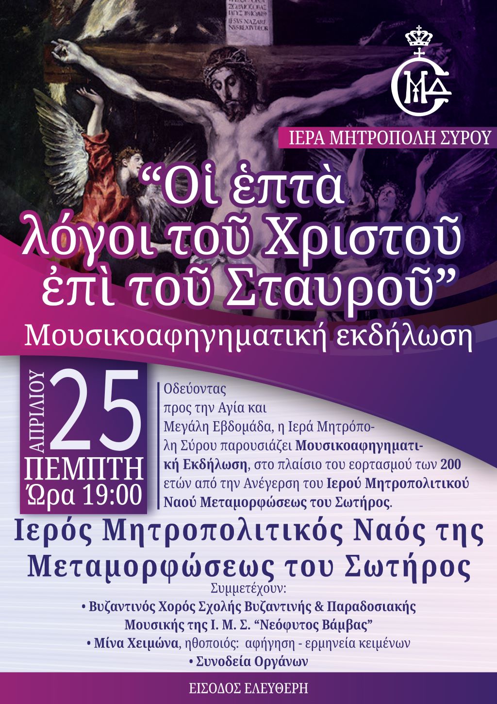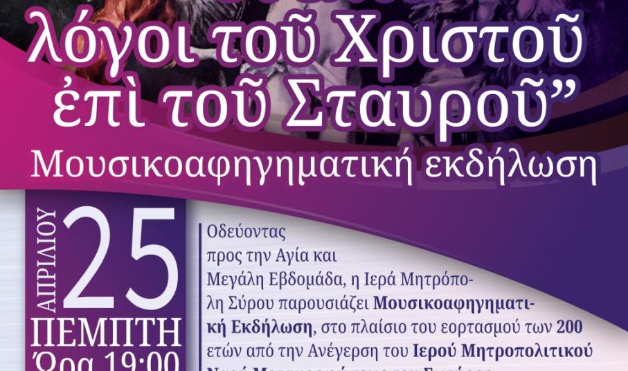 Η Ιερά Μητρόπολη Σύρου, διοργανώνει την Πέμπτη 25 Απριλίου στις 7 το βράδυ, στον Ιερό Ναό της Μεταμορφώσεως του Σωτήρος, μία μουσικο-αφηγηματική με θέμα "Οι επτά λόγοι του Χριστού επί του Σταυρού".