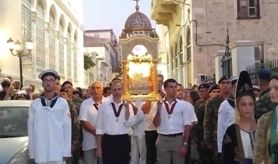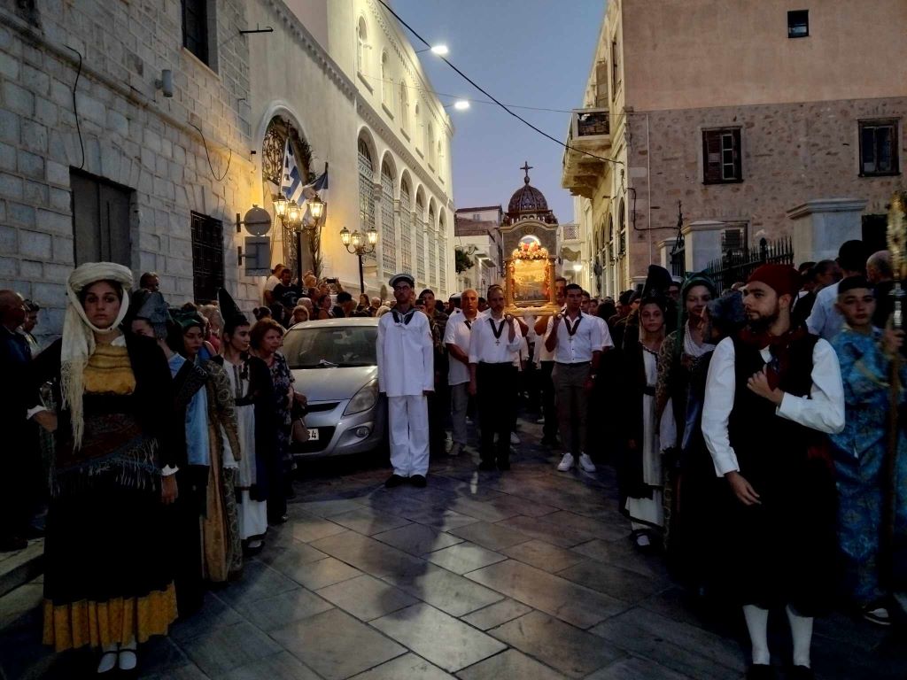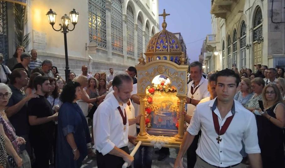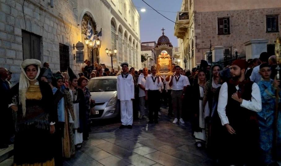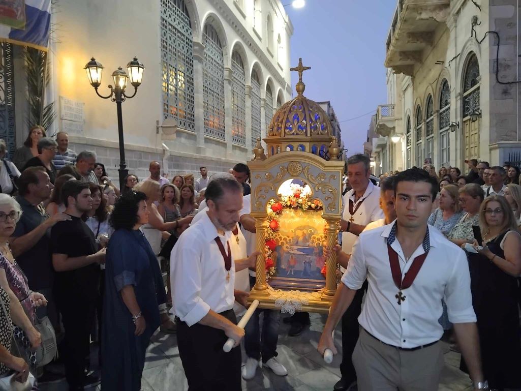 Στο πλαίσιο της μεγάλης χριστιανικής γιορτής του Δεκαπενταύγουστου, κάτοικοι κι επισκέπτες της Σύρου κάθε χρόνο, παραμονή του μεγάλου Εορτασμού, συνοδεύουν την περιφορά της εικόνας υπό τους θρησκευτικούς ήχους της Φιλαρμονικής του Δήμου Σύρου - Ερμούπολης, καταλήγοντας ξανά στον Ιερό Ναό.