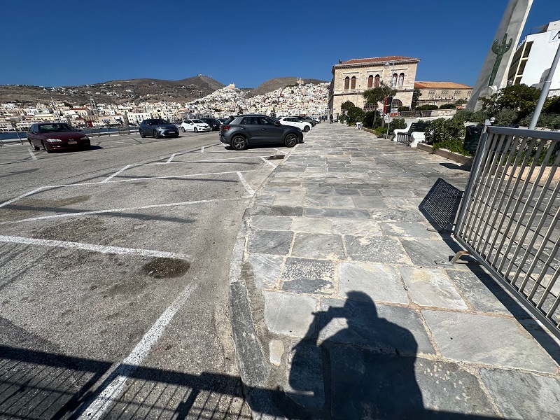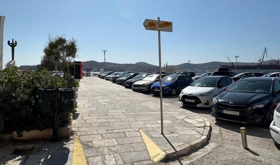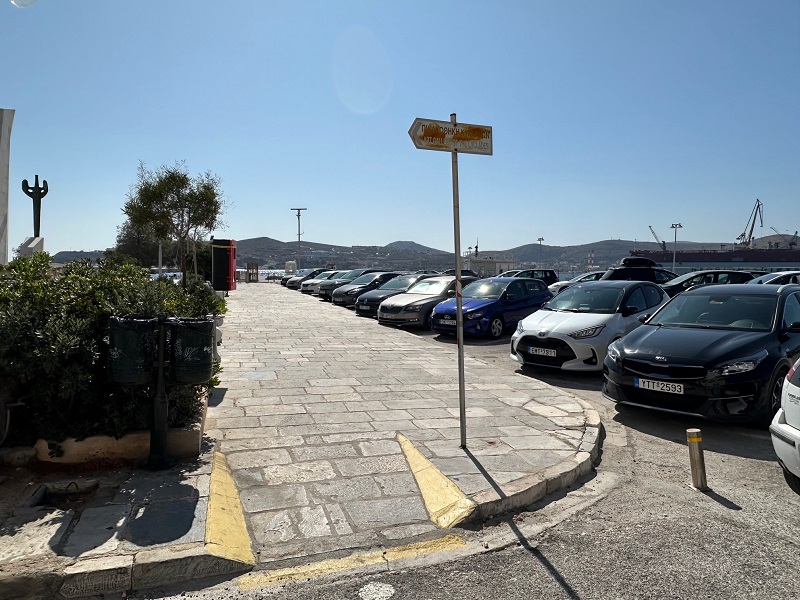 Επιπλέον, ο μη προσδιορισμός εισόδου και εξόδου – όχι μόνον από τις μπάρες που ταυτόχρονα(!) εισέρχονται και εξέρχονται οχήματα – αλλά σε διαφορετικά ύψη του parking, οδηγεί τους πεζούς να κάνουν άσκοπες κι επικίνδυνες μετακινήσεις μέσα στον χώρο, αναζητώντας ένα “άνοιγμα” για να βγουν. Σε αυτό το σημείο, πρέπει να αναφερθεί πως σε ημέρες που δεν υπάρχει κρουαζιερόπλοιο, θα μπορούσε να αφαιρείται ένα μικρό τμήμα της περίφραξης, ώστε να εξέρχονται με ασφάλεια οι πεζοί και να περπατούν από το παραλιακό τμήμα, για να φτάσουν στο ύψος της πλατείας Κανάρη, το οποίο διαθέτει και ράμπα ΑΜΕΑ. Άλλωστε, αυτό επιβάλλει η μάταιη αναζήτησή τους για έξοδο απέναντι από το ύψος του Τελωνείου με τα μεταλλικά κολωνάκια, καθώς συνήθως είναι σταθμευμένα οχήματα κατά μήκος.