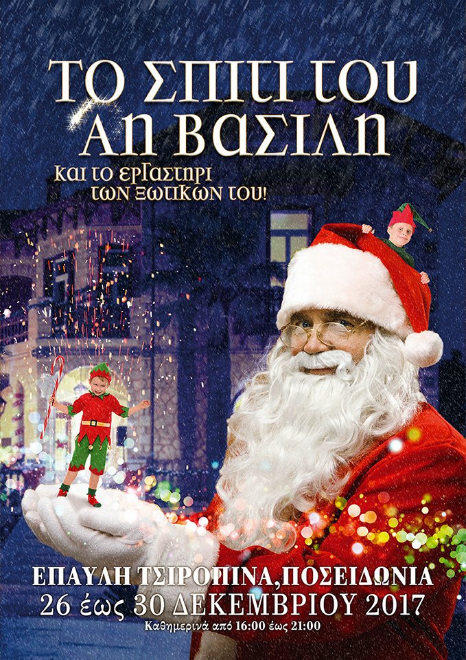 Θεατρικές παραστάσεις, τραγούδια, χοροί, αφηγήσεις παραμυθιών και πολλές ακόμη εκπλήξεις θα κάνουν και φέτος ευχάριστη και φαντασμαγορική την παραμονή του αγαπημένου Άη-Βασίλη στην Έπαυλη Τσιροπινά στην Ποσειδωνία, όπου για 6η συνεχή χρονιά θα υποδεχτεί τους μικρούς και μεγάλους φίλους του.