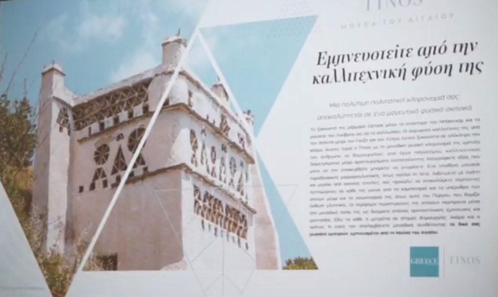Σε ό,τι αφορά στο κομμάτι της εικαστικής ταυτότητας της Τήνου, δηλαδή τον τρόπο με τον οποίο αποδίδεται οπτικά και επικοινωνιακά ο προορισμός, παρουσιάστηκε το κύριο σύμβολο – χαρακτήρας της ταυτότητας, που δεν είναι άλλο από τα τρίγωνα. «Η έμπνευση της εικαστικής ταυτότητας προέρχεται από τα ίδια τα σχέδια και τα μοτίβα τα οποία προσφέρει η Τήνος στην αρχιτεκτονική της (σ.σ. περιστερώνες), ανέφερε ο μελετητής, επισημαίνοντας, ότι έχουν χρησιμοποιηθεί γήινοι χρωματισμοί και φυσικά το λευκό του μαρμάρου, προκειμένου να αποτυπωθεί ο προορισμός σε μία εικόνα, που θα συνοδεύει τα μηνύματα, που θα προωθηθούν.