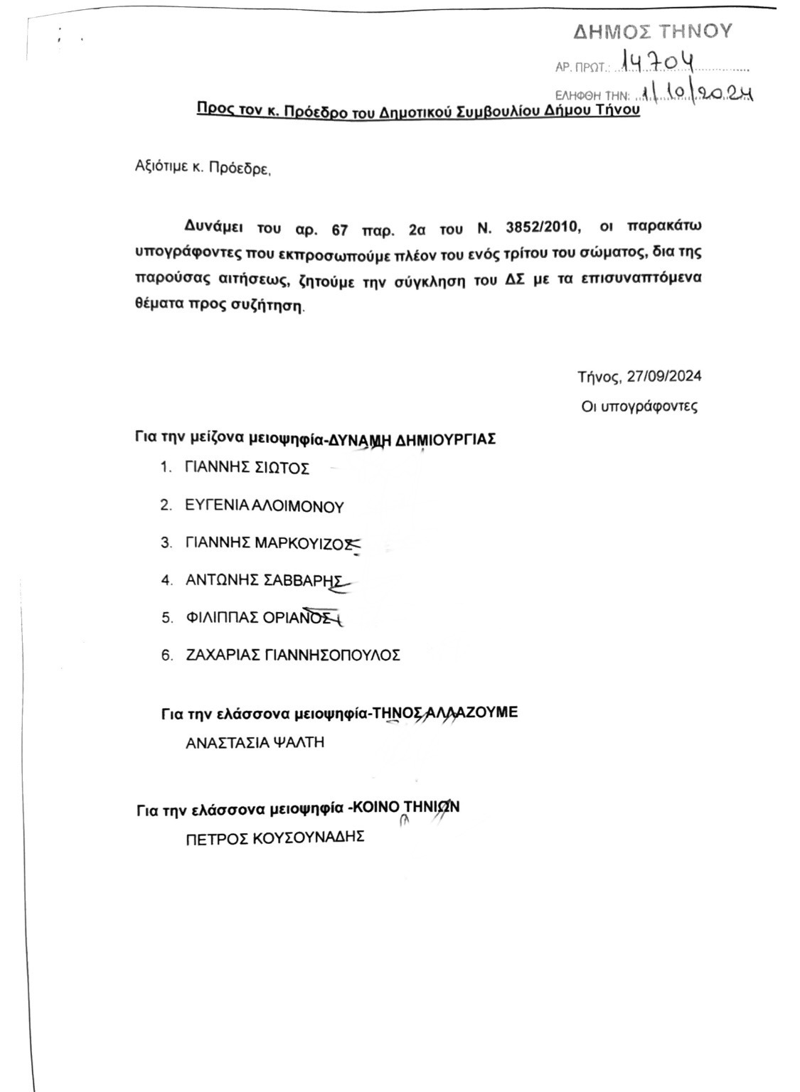 Σύγκληση του Δημοτικού Συμβουλίου με θέμα το νερό ζήτησαν με επιστολή τους προς τον πρόεδρο του ΔΣ Δήμου Τήνου κ. Νικόλαο Γκύζη, οι επικεφαλής και τα μέλη της μείζονος και ελάσσονος αντιπολίτευσης.
