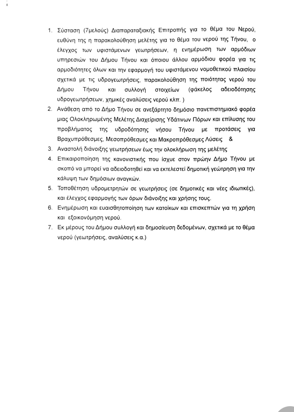 1. Σύσταση (7μελούς) Διαπαραταξιακής Επιτροπής για το θέμα του Νερού. Ευθύνη της η παρακολούθηση μελέτης για το θέμα του νερού της Τήνου, ο έλεγχος των υφιστάμενων γεωτρήσεων, η ενημέρωση των αρμόδιων υπηρεσιών του Δήμου Τήνου και όποιου άλλου αρμόδιου φορέα για τις αρμοδιότητες όλων και την εφαρμογή του υφιστάμενου νομοθετικού πλαισίου σχετικά με τις υδρογεωτρήσεις, παρακολούθηση της ποιότητας νερού του Δήμου Τήνου και συλλογή στοιχείων (φάκελος αδειοδότησης υδρογεωτρήσεων, χημικές αναλύσεις νερού κλπ )
