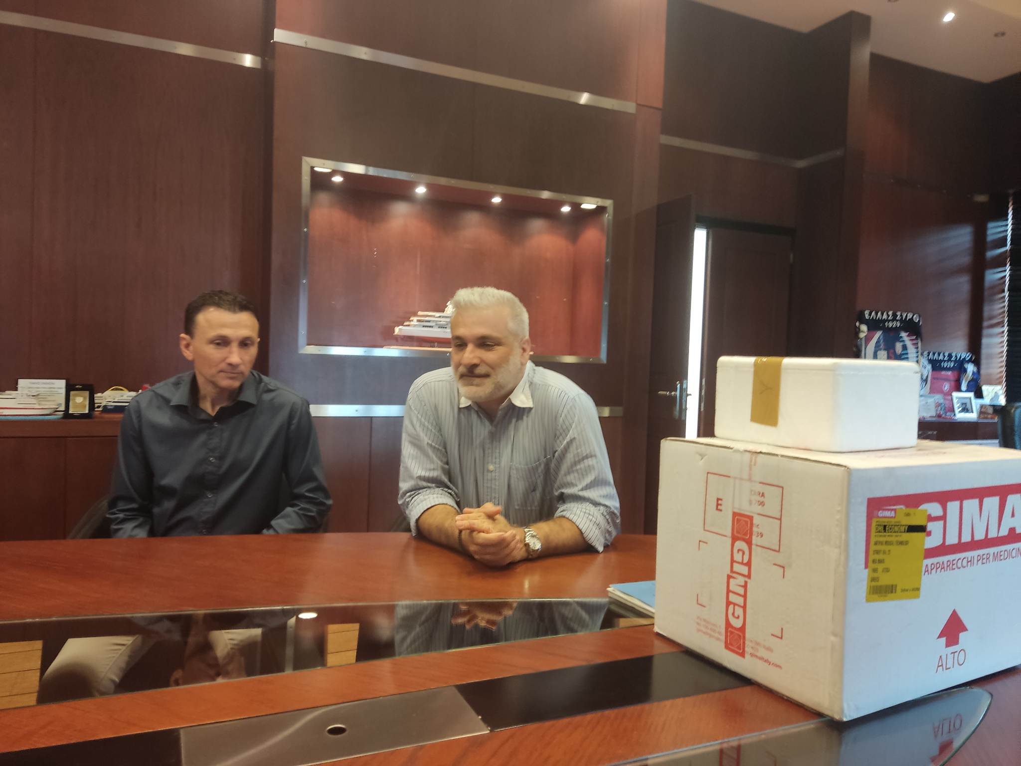 “Στο πλαίσιο της εταιρικής κοινωνικής ευθύνης της ONEX είχαμε συμφωνήσει για μία δωρεά κάποιων απαραίτητων συσκευών για τη λειτουργία του ΕΚΑΒ Σύρου και συγκεκριμένα στο τμήμα αεροδιακομιδών. Αν και ήταν μία απλή υπόθεση, πέρασε από σαράντα κύματα λόγω γραφειοκρατικών διαδικασιών επειδή έπρεπε να υπογραφεί σχετική σύμβαση με το ΕΚΑΒ, να ληφθεί η έγκριση από το Διοικητικό Συμβούλιο του ΕΚΑΒ και και στη συνέχεια να προβούμε στη δωρεά. Πρόκειται για ένα video λαρυγγοσκόπιο και ένα φορητό μηχάνημα - αναλυτής αερίων”, ανέφερε αρχικά ο κ. Πασχαλίδης, τονίζοντας πως σήμερα, “είμαστε στην ευχάριστη θέση να τα παραδώσουμε στο ΕΚΑΒ”.