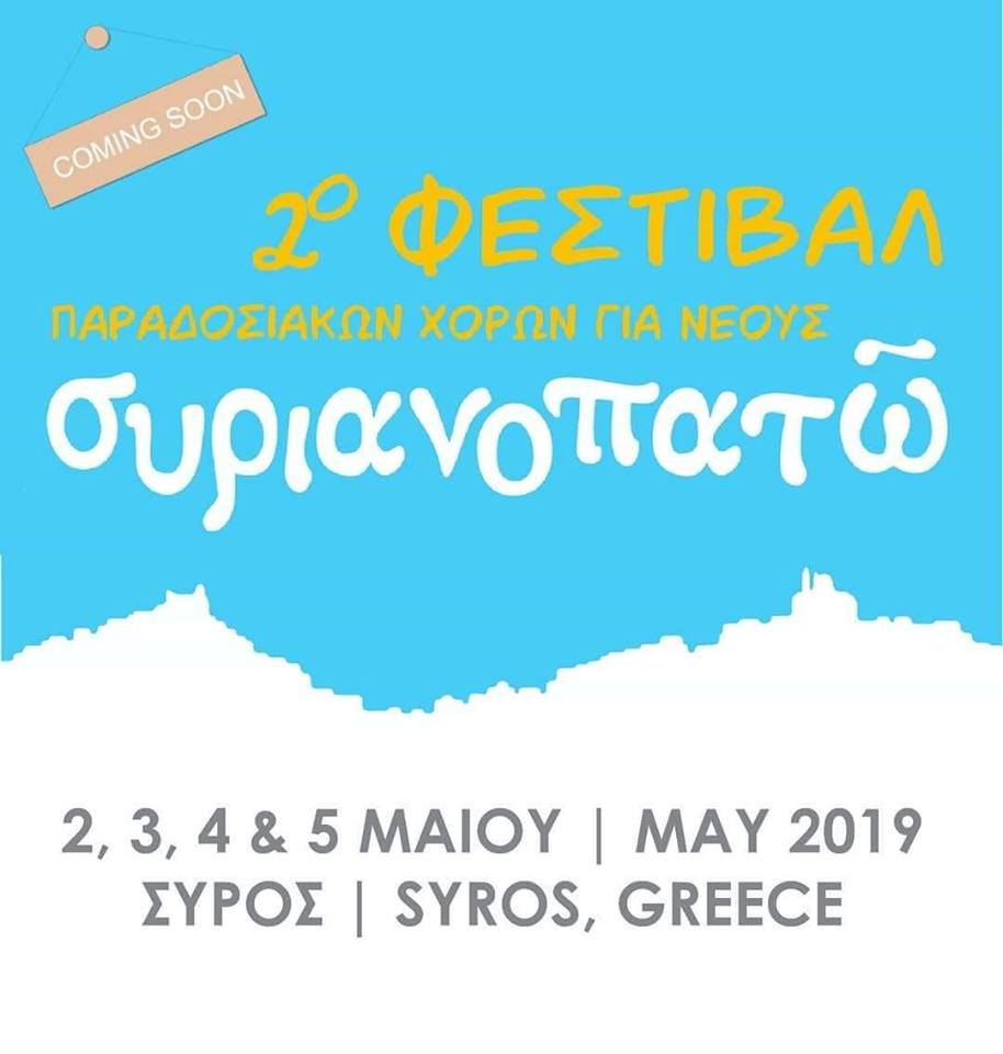 Το Φεστιβάλ Παραδοσιακών χορών για νέους "συριανοπατῶ" -δημιούργημα του Λαογραφικού – Χορευτικού Ομίλου «η σοφία της παράδοσης»- επιστρέφει την άνοιξη στον πολιτιστικό χάρτη του νησιού, αποτελώντας την πρώτη μεγάλη διοργάνωση του προγράμματος «Σύρος – Πολιτισμός 2019».