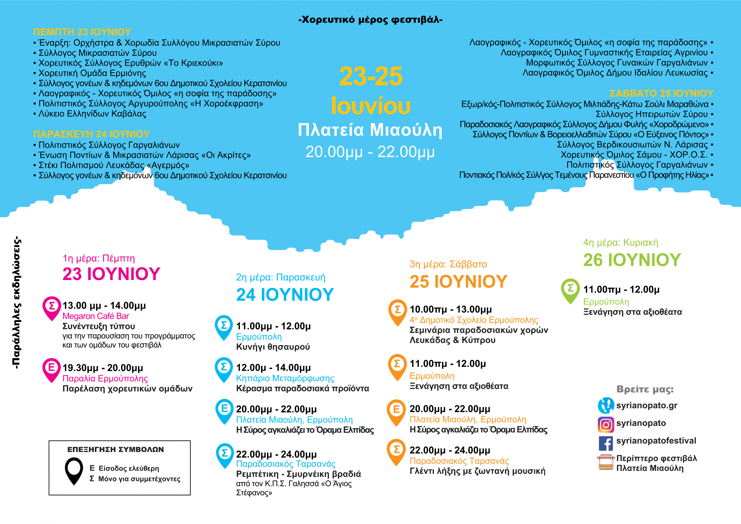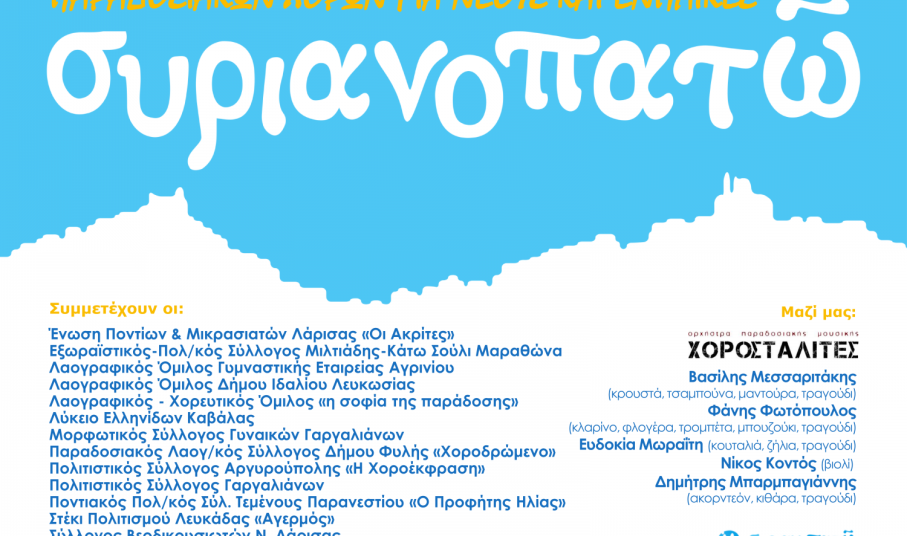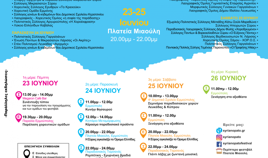 Η πολύ όμορφη διοργάνωση παραδοσιακών χορών ΣΥΡΙΑΝΟΠΑΤΩ ξεκινά αύριο, 23 Ιουνίου. Δείτε στη φωτογραφία το πρόγραμμα.
