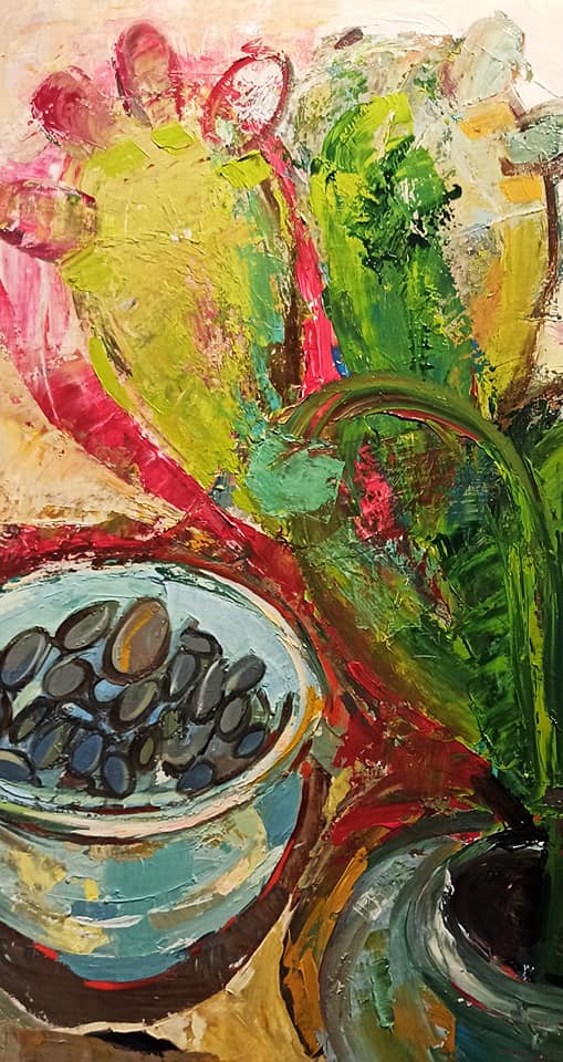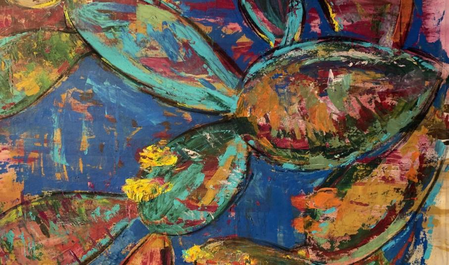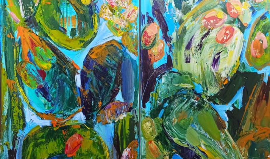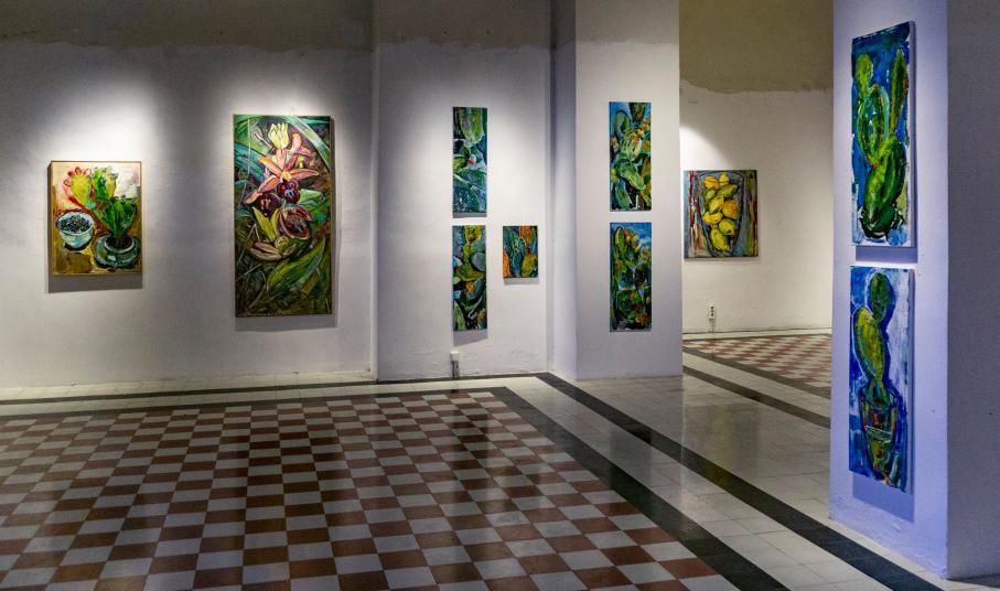 Η ατομική έκθεση της Αγγελικής Μπρινόσβαλη “Cactus & Others II” φιλοξενείται στην Αίθουσα Τέχνης «Γιάννη & Ελένης Βάτη» - μια όαση δροσιάς και χαράς τόσο σαν χρωματική αίσθηση από τα έργα της εικαστικού όσο και σαν μοναδικής ομορφιάς διατηρηταίος χώρος του Δημαρχιακού Μεγάρου Ερμούπολης, σχεδιασμένου από τον Ερνέστο Τσίλλερ.