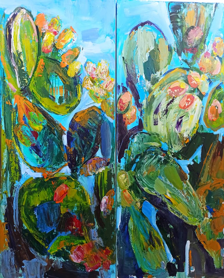 «Η φραγκοσυκιά είναι ένα δυνατό αυτοφυές φυτό και ζει με τα πολύ ελάχιστα που της προσφέρει η κυκλαδίτικη γη. Ζει με λίγο ή και χωρίς νερό για μεγάλα χρονικά διαστήματα, ζει στον καυτό ήλιο με υπομονή, και όταν είναι να ανθίσει και να καρποφορήσει το κάνει με μεγάλη γενναιοδωρία. Αυτά είναι σχεδόν ανθρώπινα χαρακτηριστικά τα οποία παρατηρώ τα 20 χρόνια που είμαι στη Σύρο και ταξιδεύω στα γύρω νησιά. Η Φραγκοσυκιά μας διδάσκει κάποιες αρετές και αγαπώ το φυτό αυτό για τις μεταφορικές του χάρες. Από την άλλη σαν εικαστικός, λατρεύω τον τρόπο με τον οποίο κάνει φυσικούς ελιγμούς με τον τρόπο που μεγαλώνει και πολλαπλασιάζεται, πάει προς όλες τις κατευθύνσεις, γέρνει φυτρώνει ξανα-ανεβαίνει και απλώνεται, αμύνεται αλλά και προσφέρει χρώμα και καρπούς που σπάνε αυτή τη φαινομενική μονοτονία του πράσινου που για μένα ανάλογα με το φως μετουσιώνεται σε πολλά ακόμα χρώματα. Μαζί με τη θάλασσα σα φόντο ή τη ξερή καλοκαιρινή γη των Κυκλάδων, σα θέμα οι φραγκοσυκιές δίνουν μεγάλες και φοβερές ευκαιρίες σε μία ζωγράφο να εκφραστεί».