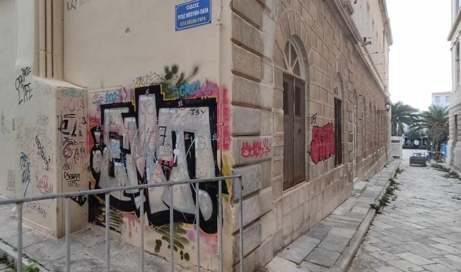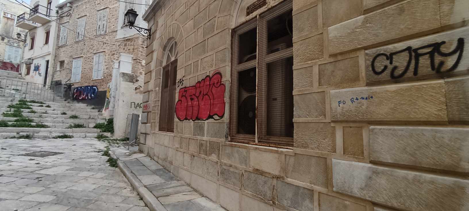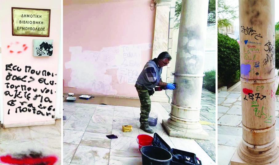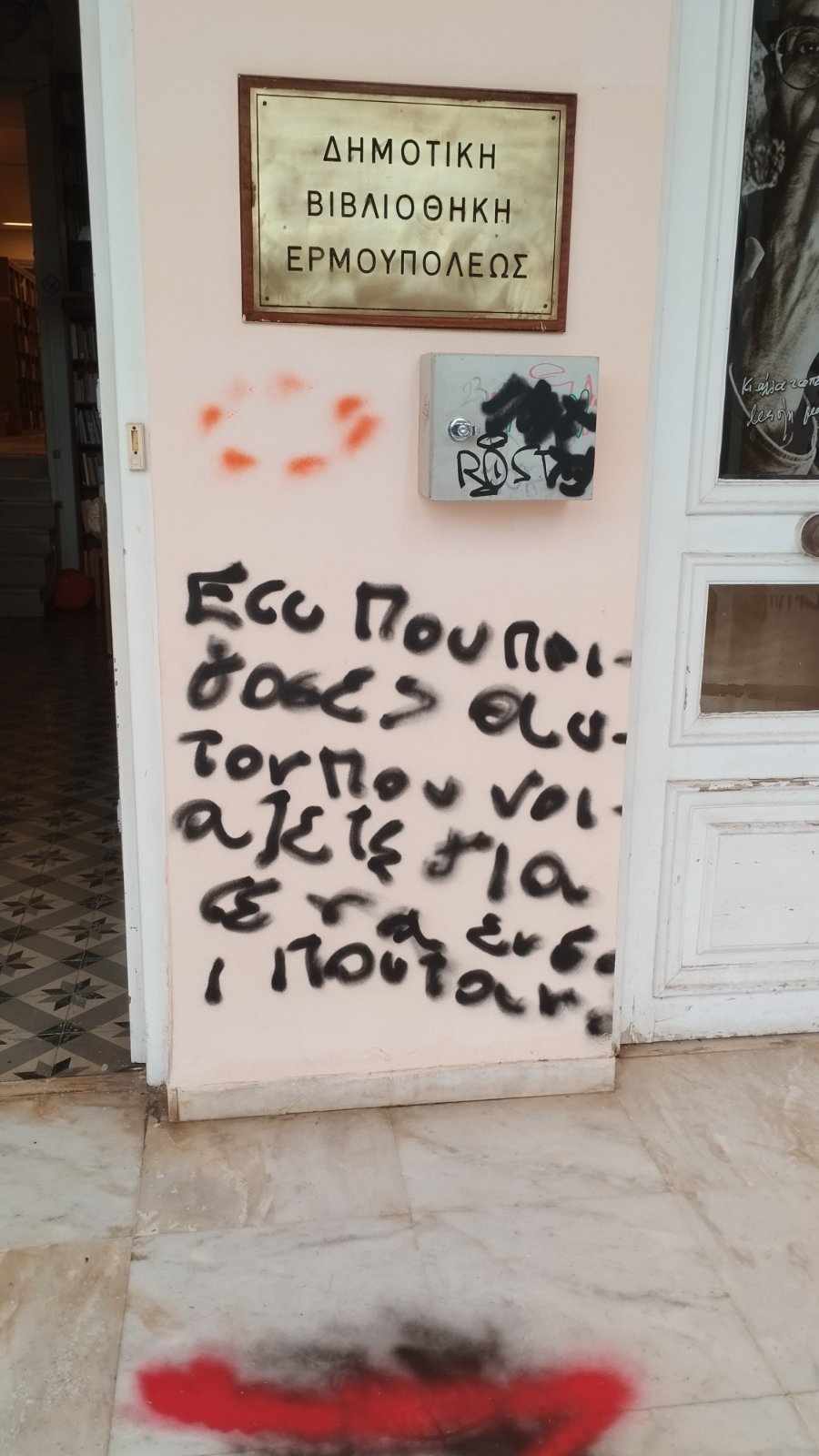 Όλο το τελευταίο διάστημα είναι σε έξαρση οι βανδαλισμοί και οι φθορές με σπρέι και μπογιές στο κέντρο της Ερμούπολης, με μεγάλα “θύματα” να είναι τα ιστορικής και αρχιτεκτονικής αξίας κτήρια, τόσο δημόσια, όσο και ιδιωτικά. Μετά από τις φθορές στο Δημαρχιακό Μέγαρο, στο Πνευματικό Κέντρο, στην Καθολική εκκλησία της Ερμούπολης, στα κουβούκλια των ηλεκτρικών σκούτερ και στη μαρμάρινη εξέδρα της μουσικής στην πλατεία Μιαούλη, πήρε – δυστυχώς – σειρά, η Δημοτική Βιβλιοθήκη.