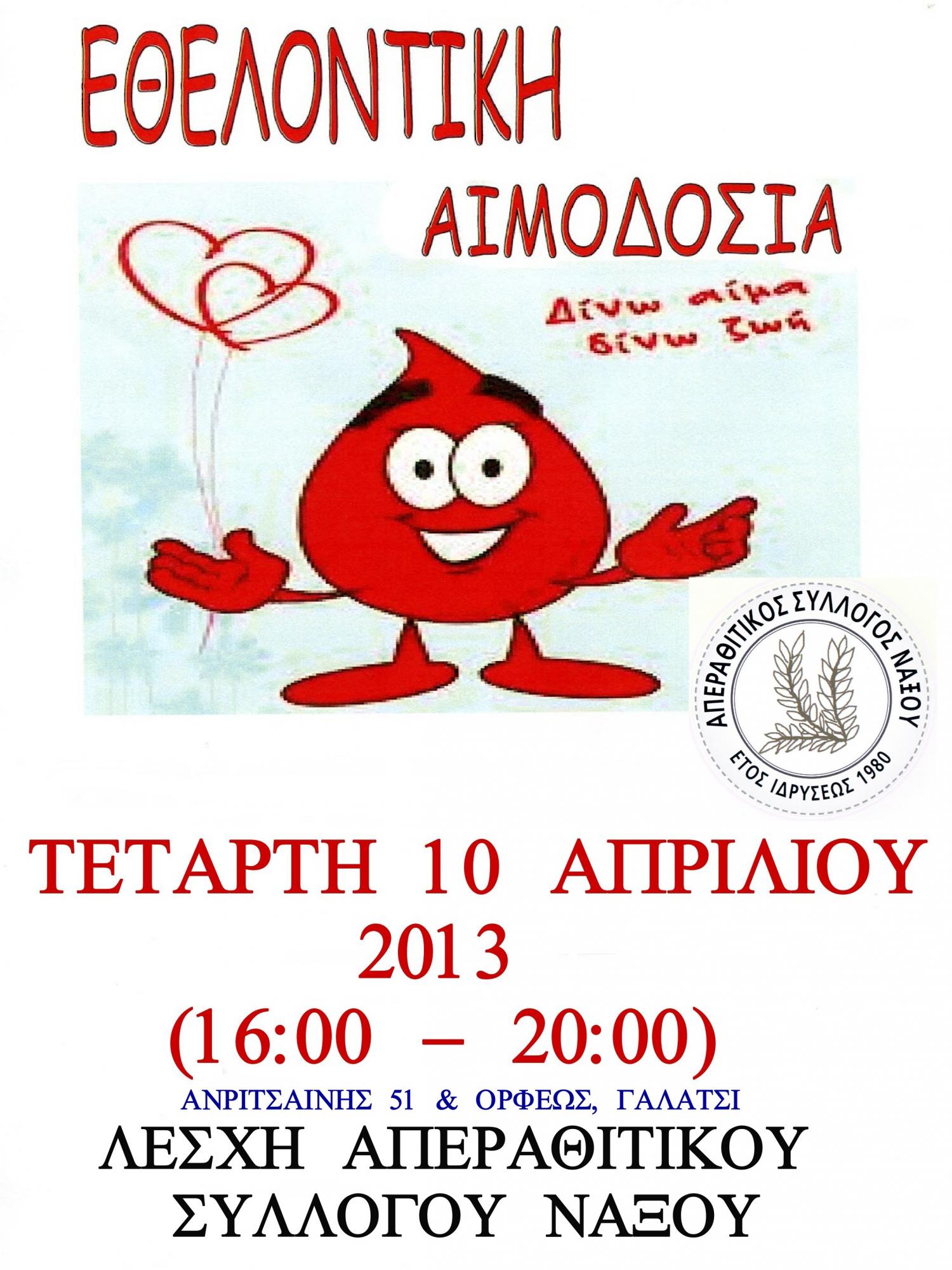 Εθελοντική αιμοδοσία, διοργανώνει η Λέσχη Απεραθίτικου Συλλόγου Νάξου. Η αιμοδοσία θα διεξαχθεί την Τετάρτη από τις 4 το απόγευμα, έως τις 8 το βρά...