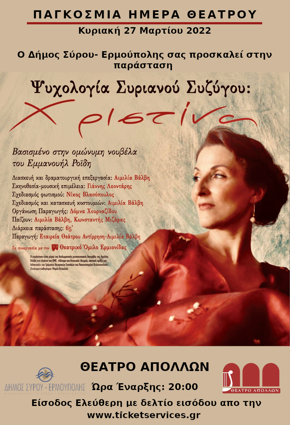 Στο πλαίσιο του εορτασμού της Παγκόσμιας Ημέρας Θεάτρου, ο Δήμος Σύρου- Ερμούπολης σας προσκαλεί στο Θέατρο Απόλλων, στην παράσταση «Ψυχολογία Συριανο...