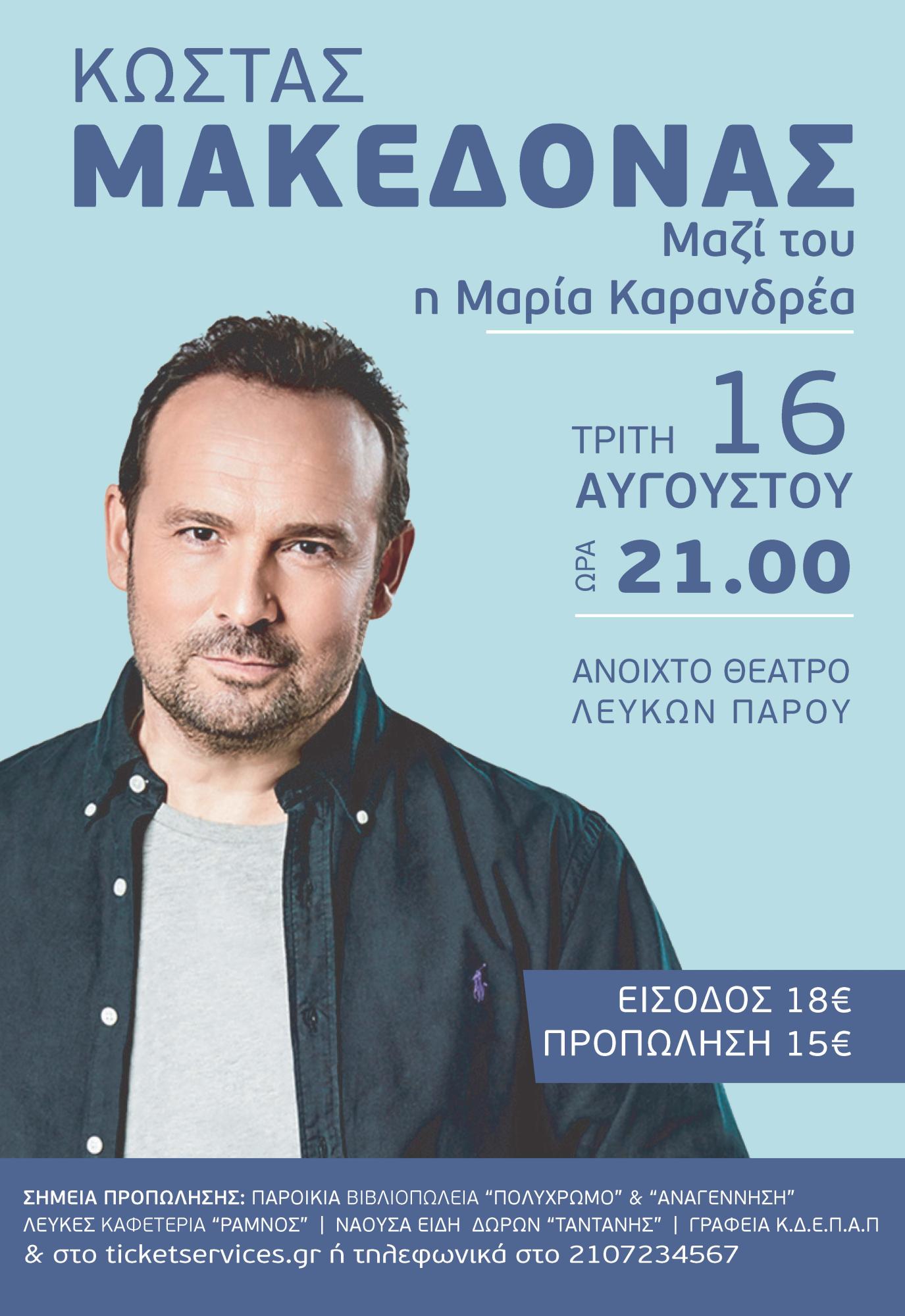Ο Κώστας Μακεδόνας μας προσκαλεί την Τρίτη 16/8/2022 στο Ανοιχτό Θέατρο Λευκών Πάρου στις 21:00. Ο Κώστας Μακεδόνας, ένας από τους κορυφαίους ερ...