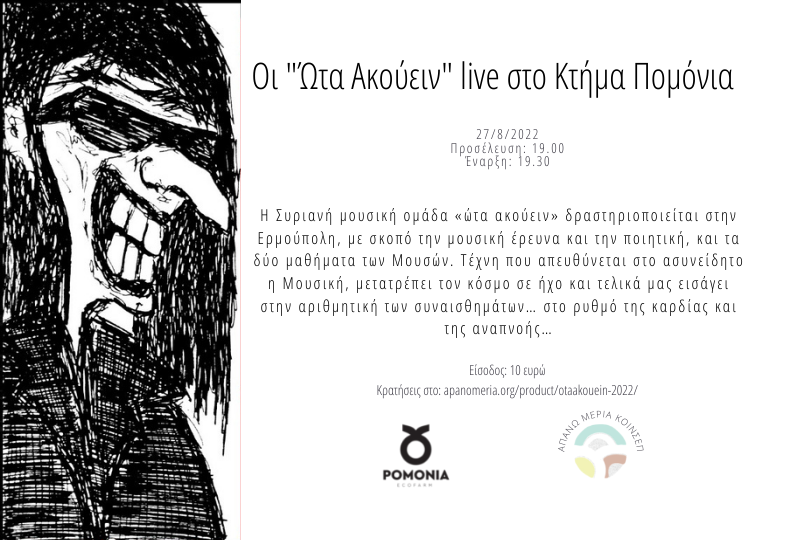 Η ΚΟΙΝΣΕΠ Απάνω Μεριά σας προσκαλεί σε μια μοναδική μουσική βραδιά, το Σάββατο 27 Αυγούστου, στο κτήμα Πομόνια, με τους Ώτα Ακούειν. Θα απολαύσουμε τη...
