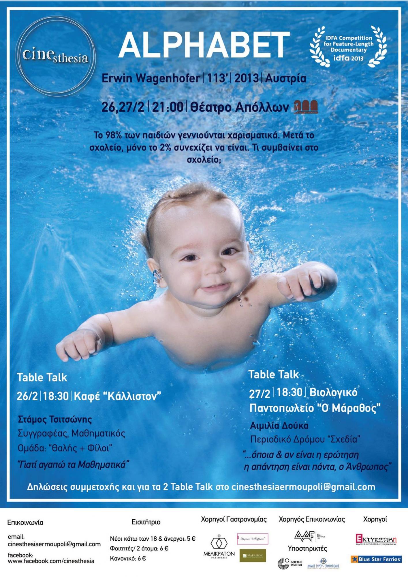 Το Cinesthesia Φεβρουαρίου, την Παρασκευή 26 και το Σάββατο 27 Φεβρουαρίου 2016 παρουσιάζει, στο Θέατρο Απόλλων, την βραβευμένη ταινία "Alphabet" και ...