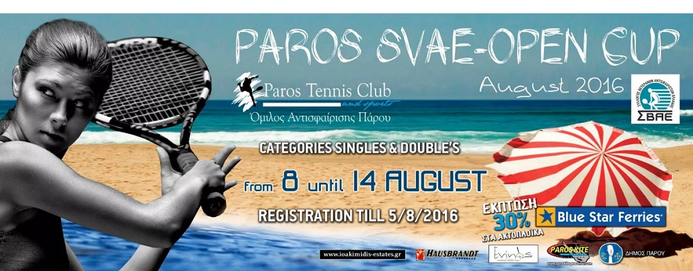 Ο όμιλος αντισφαίρισης Πάρου προκηρύσσει το Paros SVAE-Open Cup August 2016 το οποίο είναι combined τουρνουά Βετεράνων Ελλάδος και Open αντρών γυναικώ...