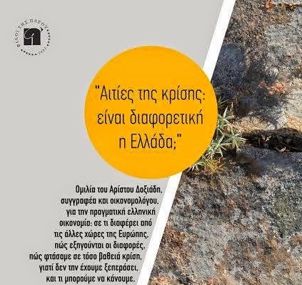 Για τις αιτίες της κρίσης και την πραγματική ελληνική οικονομία θα μιλήσει ο συγγραφέας και οικονομολόγος Αρίστος Δοξιάδης στο Δημοτικό Χώρο Τεχνών στ...