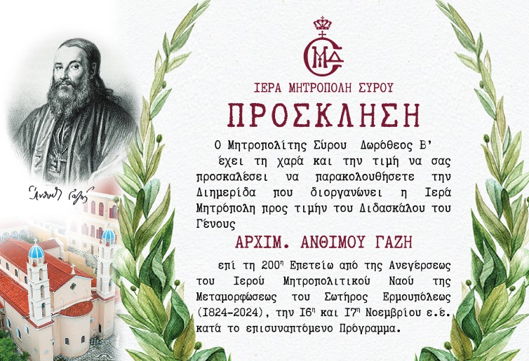 Μήνυμα - κάλεσμα απηύθυνε ο Μητροπολίτης Σύρου, Δωρόθεος Β’, για τις εορταστικές εκδηλώσεις για τον Άνθιμο Γαζή που θα λάβουν χώρα στον Μητροπολιτικό ...