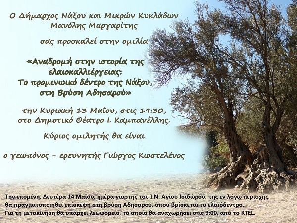 Ο Δήμαρχος Νάξου και Μικρών Κυκλάδων Μανόλης Μαργαρίτης σας προσκαλεί στην ομιλία «Αναδρομή στην ιστορία της ελαιοκαλλιέργειας: Το προμινωικό δέντρο ...