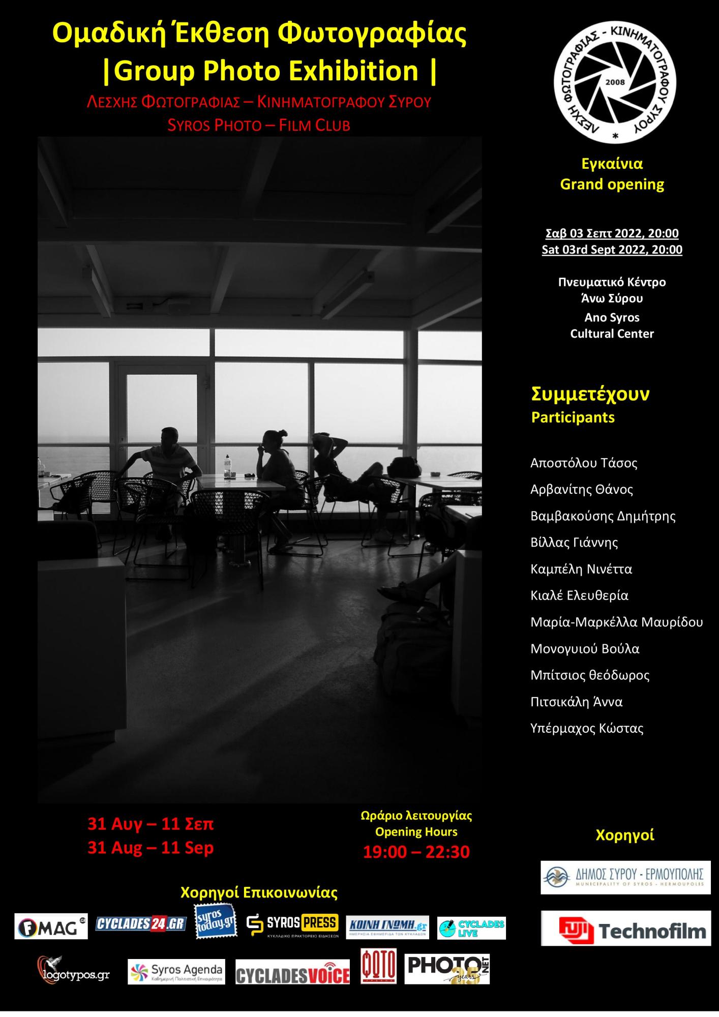 Ομαδική Έκθεση φωτογραφίας των μελών της Λέσχης Φωτογραφίας-Κινηματογράφου Σύρου που θα πραγματοποιηθεί στο Πνευματικό Κέντρο Άνω Σύρου 31/08 - 11/09....