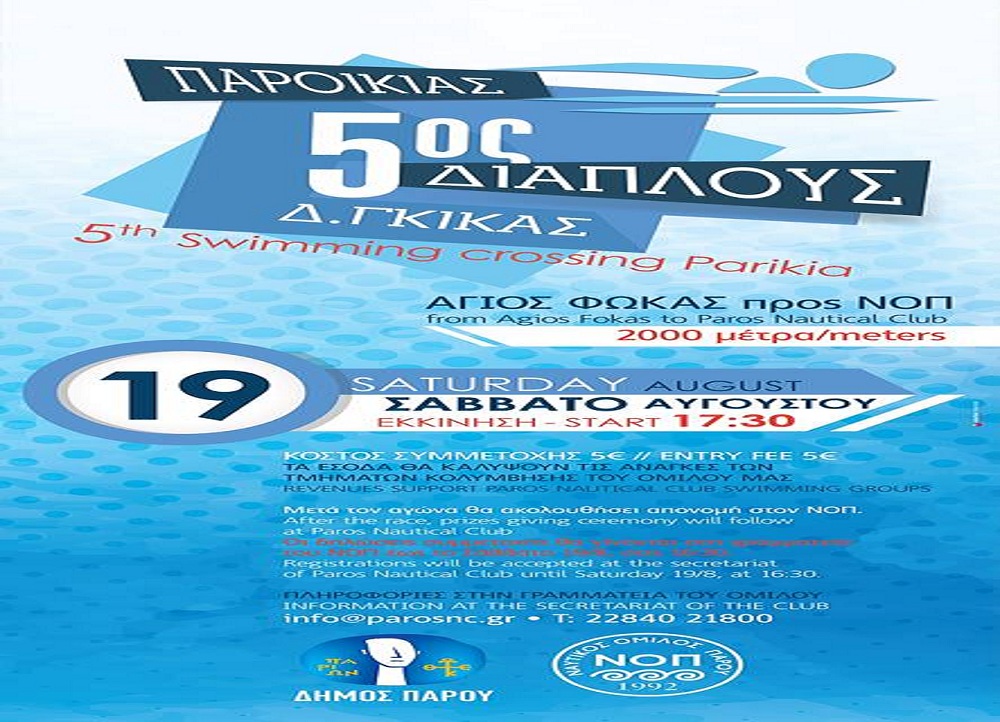 Στις 19 Αυγούστου ο Δήμος Πάρου και ο Ναυτικός Όμιλος Πάρου διοργανώνουν τον «5ο Διάπλου Παροικιάς "Δ. Γκίκας"» με συνολική απόσταση 2 χιλιομέτρων. Η...