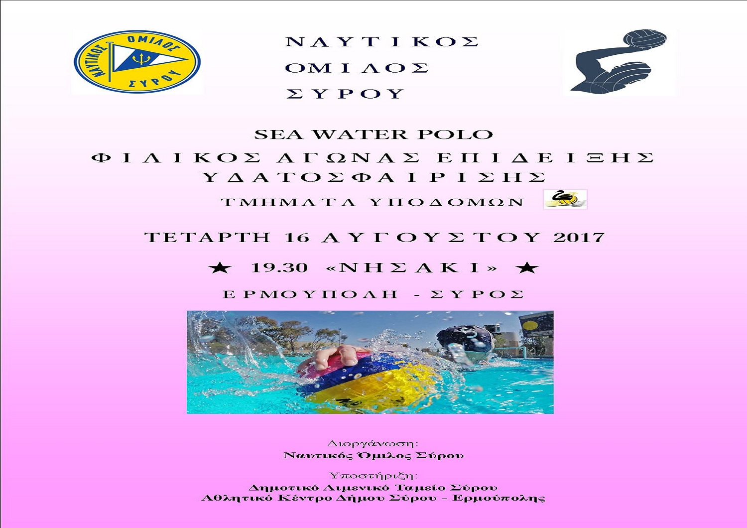 Ο Ναυτικός Όμιλος Σύρου θα δώσει έναν αγώνα επίδειξης υδατοσφαίρισης “SEA WATER POLO”, την Τετάρτη 16 Αυγούστου 2016 στις 19:30 το απόγευμα στην περιο...