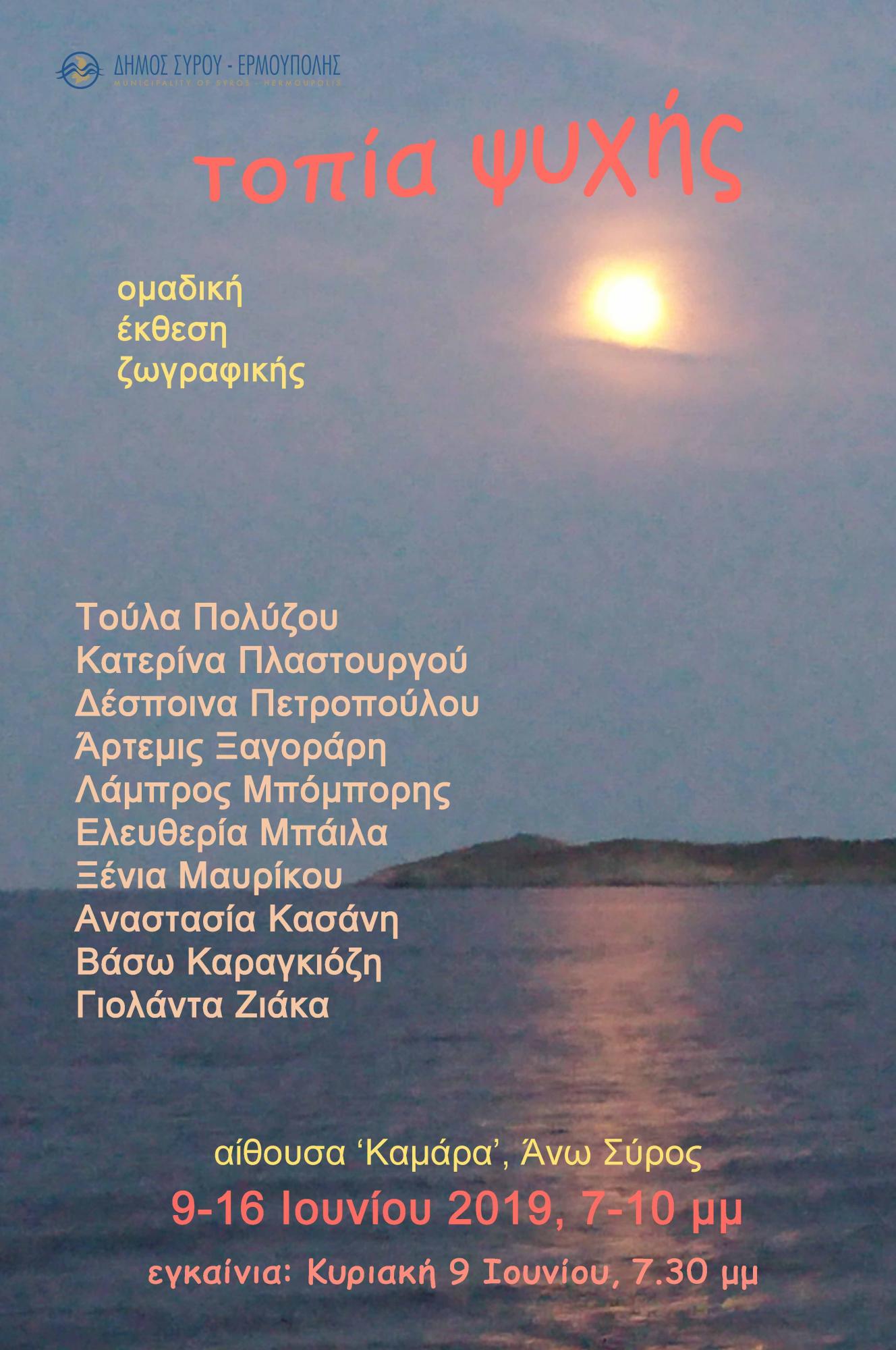 "Τοπία ψυχής" η ομαδική έκθεση ζωγραφικής στην αίθουσα 'Καμάρα', Άνω Σύρος 9 έως 16 Ιουνίου, 7-10 μμ. Εγκαίνια: Κυριακή 9 Ιουνίου 2019, στις 7....